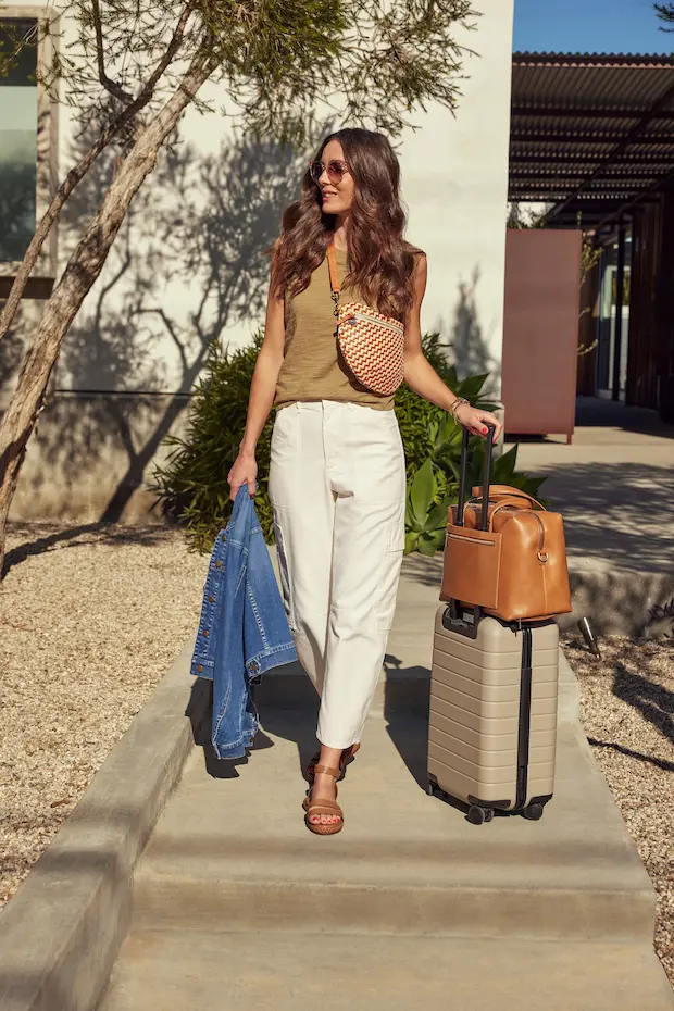 Get StyledIf you’re all about denim, wear your favorite pair on the plane and save precious space in your suitcase. Layer up in a tank underneath a sweatshirt, light sweater, or utility jacket to keep you cozy in-flight, then ditch the layers once you land and wear them throughout your trip.