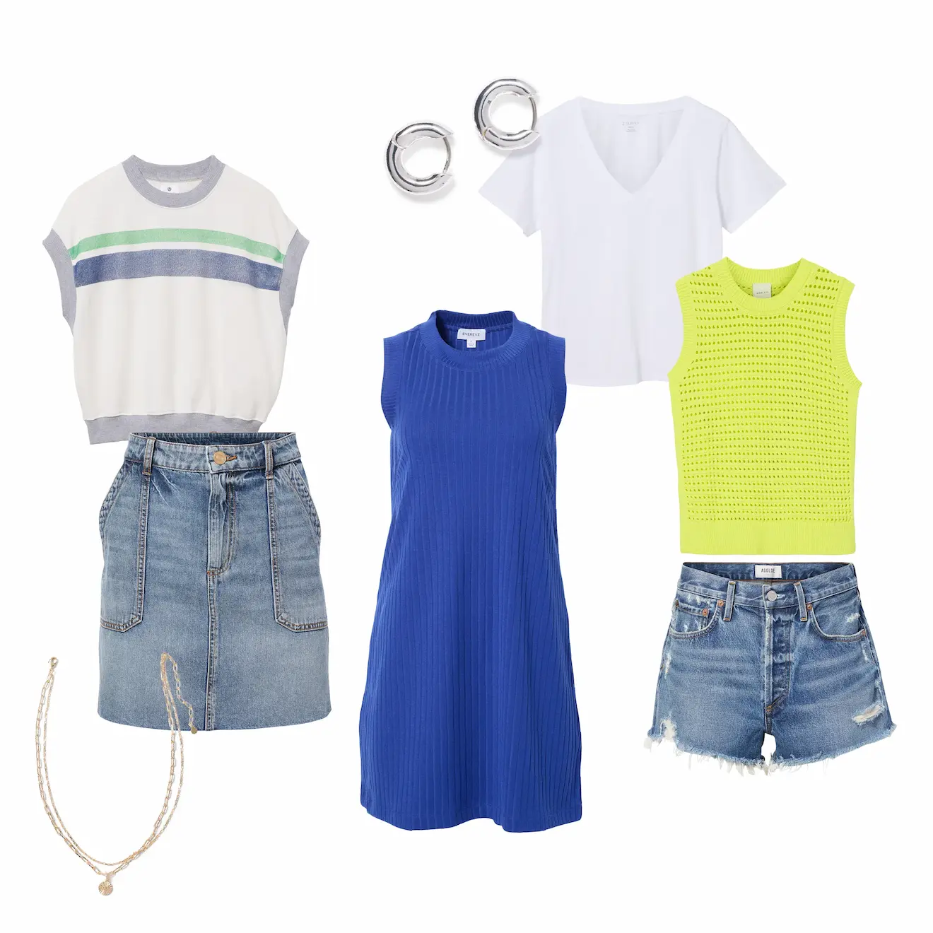 If you’re on Team Dress versus Team Shorts, a lightweight, breezy midi or minidress in a solid color or versatile print like a classic stripe will never steer you wrong. It’s great with sandals and sneakers, and you can play with proportions by tying a thin knit sweater around your waist too. We love a great dress paired with a chic tote and sandal for a day that starts with brunch and ends with an impromptu backyard BBQ.